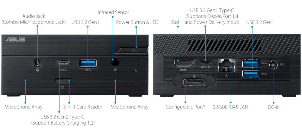 В оснащение может входить модуль беспроводной связи с поддержкой Wi-Fi 802.11ac и Bluetooth 5.0 или Wi-Fi 6 и Bluetooth 5.0. Кроме того, присутствуют порты 2.5GbE, USB 3.1 Gen2 Type-C, USB 3.1 Gen1 Type-A и другие, как показано на иллюстрации. Среди них можно выделить конфигурируемый порт. В этом месте может быть установлен видеовыход VGA или Display Port, разъём последовательного или сетевого порта. Работает мини-ПК от источника постоянного напряжения 19 В мощностью 65 Вт.