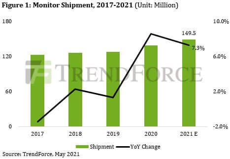 Рост продолжился в первом квартале текущего года. В годовом выражении он оказался равен 34,1%. Ожидается, что в текущем квартале рост превысит 10%. Всего же за 2021 год будет отгружено 150 млн мониторов, что соответствует росту поставок на 7,3%.