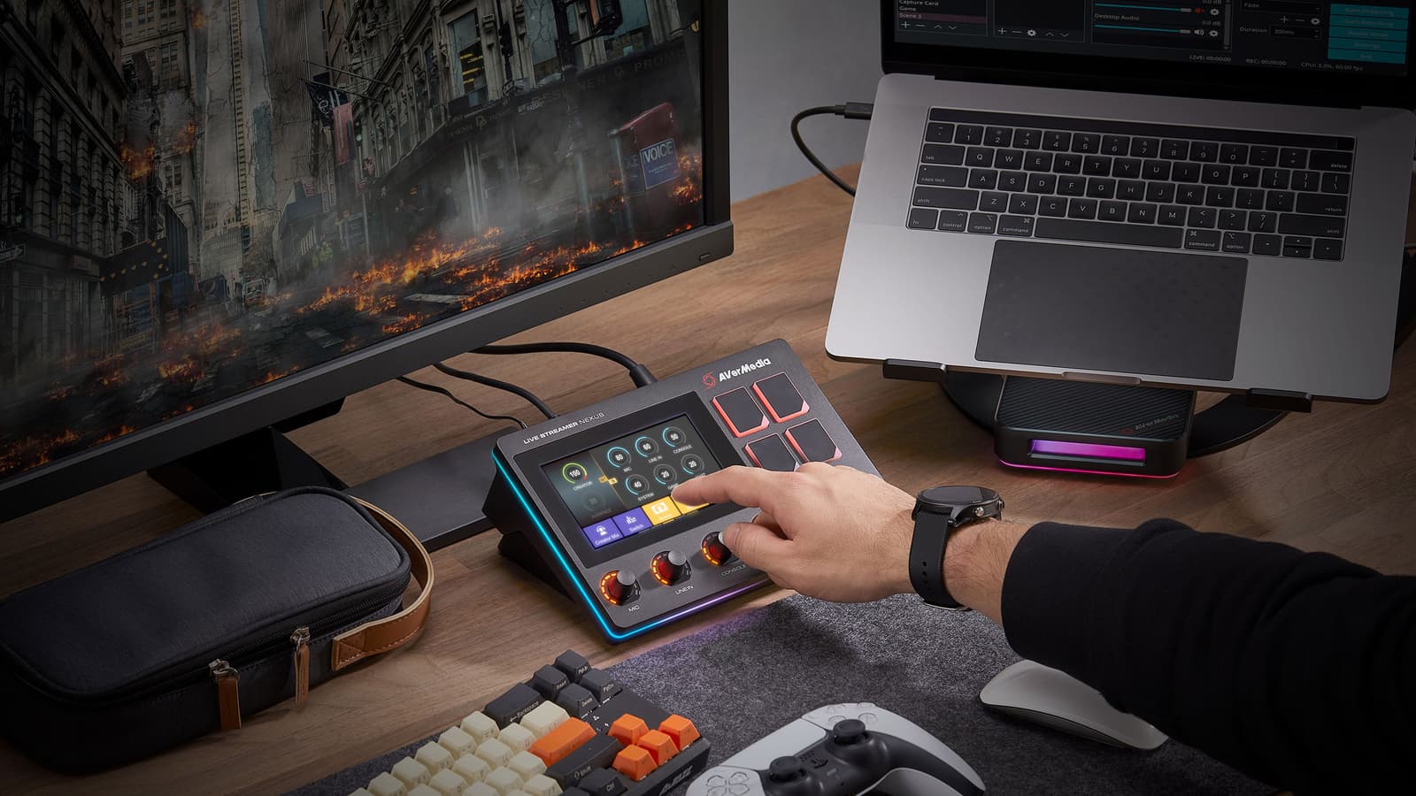 Микшер объединён с центром управления, оснащённым пятидюймовым сенсорным экраном и четырьмя функциональными кнопками. Используя приложение Nexus, можно настроить центр управления, чтобы с его помощью управлять прямыми трансляциями. Например, менять сцену, запускать поток, управлять воспроизведением, уровнями громкости и т.п. Приложение Nexus связывает пульт с популярным программным обеспечением для потоковой передачи и творчества, включая OBS, Streamlabs OBS, RECentral, YouTube, Twitch и Spotify. Обещано добавление поддержки другого ПО и новых функций в бесплатных обновлениях.