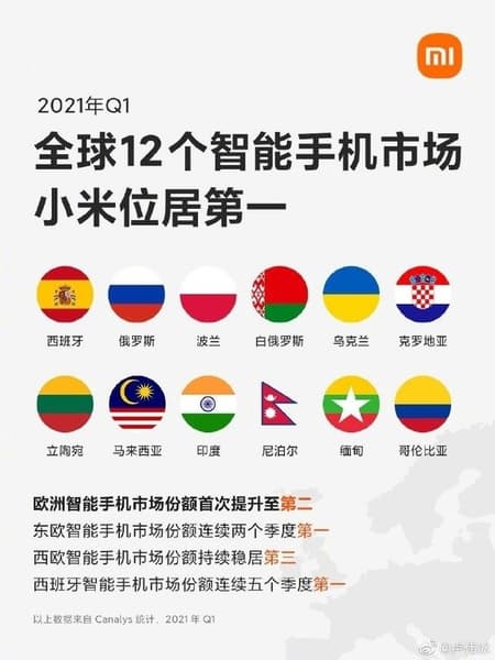 В числе этих стран — Испания, Россия, Польша, Белоруссия, Украина, Хорватия, Литва, Малайзия, Индия, Непал, Мьянма и Колумбия. Лу Вейбинг отмечает, что Xiaomi уже поднялась на второе место на рынке смартфонов в Европе, а на рынке смартфонов Восточной Европы лидирует уже два квартала подряд. В Западной Европе компания удерживает третье место, но, к примеру, в Испании Xiaomi — номер один уже пять кварталов подряд.