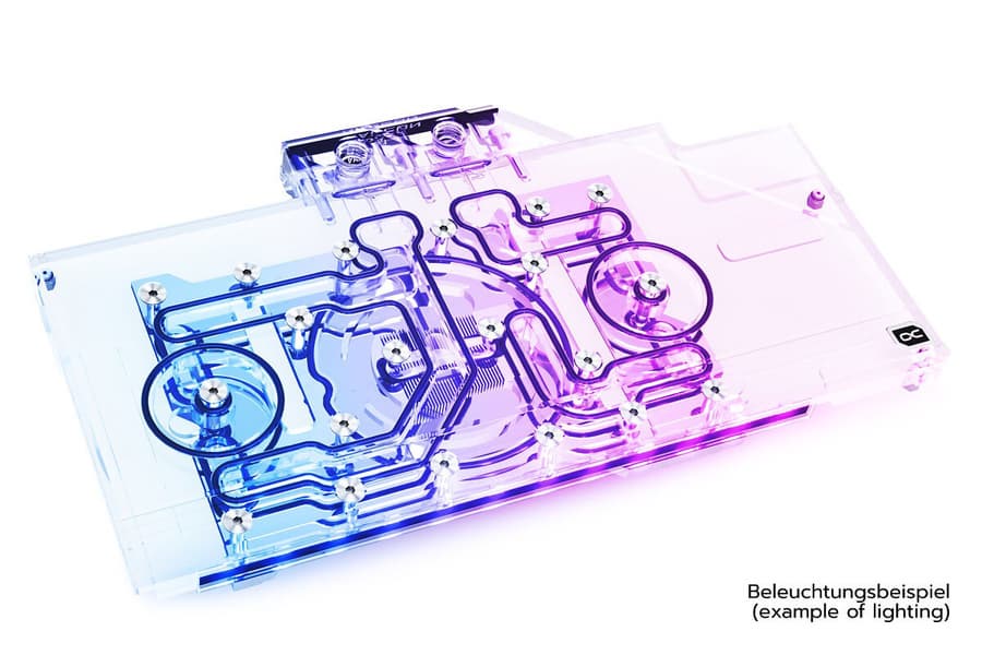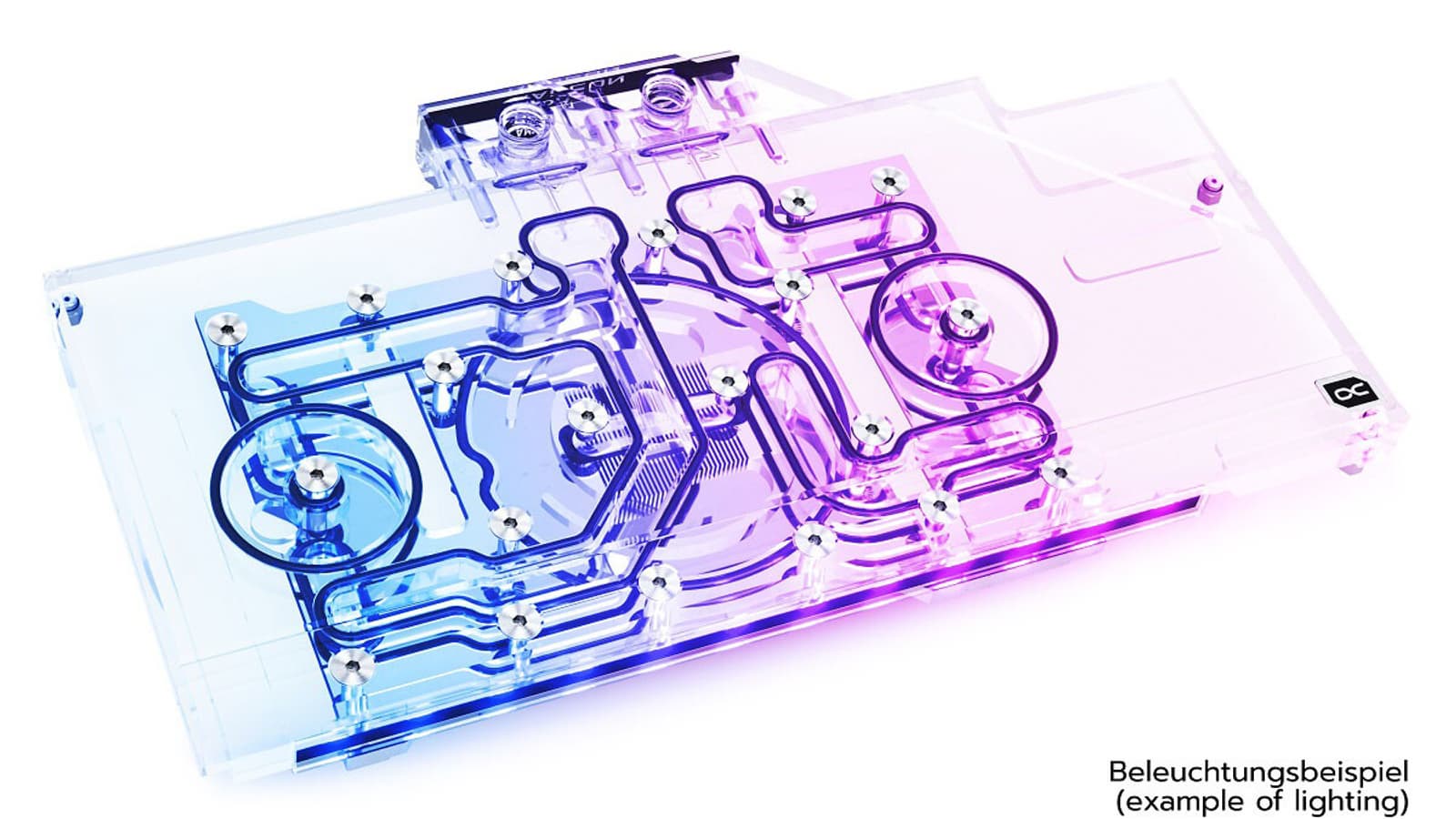 Крышка изготовлена из прозрачного пластика и украшена адресуемой подсветкой. Габариты водоблока равны 143 x 260 x 24,5 мм. В комплект входит алюминиевая пластина размерами 118 x 260 x 6 мм, закрепляемая на тыльной стороне печатной платы. Она распределяет тепловые и механические нагрузки, а также улучшает внешний вид видеокарты.