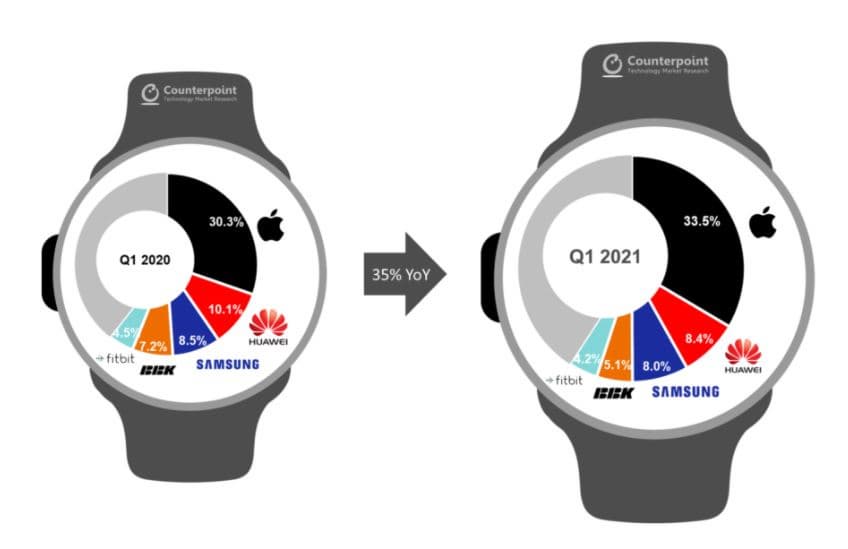 Специалисты аналитической компании Counterpoint Research подвели итоги первого квартала текущего года на рынке умных часов. Они определили, что продажи этих устройств в годовом выражении выросли на 35%.