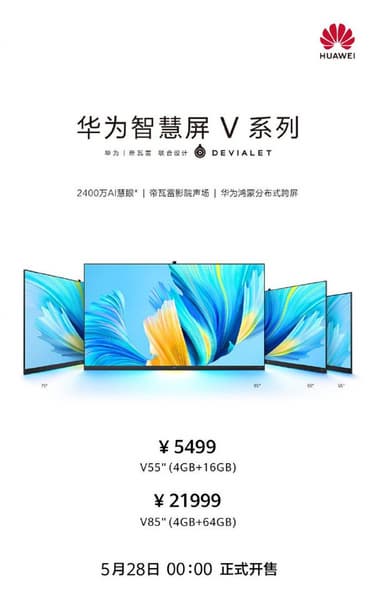 Напомним, телевизоры оснащены матрицами 4К с кадровой частотой 120 Гц и работают под управлением ОС HarmonyOS. В их конфигурации адаптеры Ethernet, Wi-Fi и NFC, 9-компонентная акустика Devialet (мощность громкоговорителей младшей модели — 36 Вт, старшей — 75 Вт) и 24-мегапиксельные веб-камеры. Аппаратная платформа в обоих случаях Honghu 818 с двумя ядрами ARM Cotrex-A73 и двумя ARM Cortex-A53. CPU соединён с 4 ГБ ОЗУ, но объём флеш-памяти разный: у Smart Screen V55 — 16 ГБ, у Smart Screen V85 — 64 ГБ.