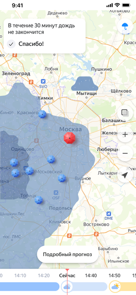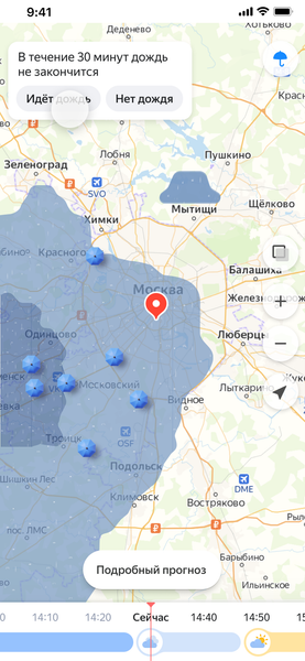 На карте осадков легко увидеть, где идут дожди, и узнать прогноз на ближайшие два часа с детализацией в десять минут. Можно посмотреть на карту и решить, когда лучше погулять с собакой или, например, сбегать в магазин. Как отмечают разработчики, при составлении карты осадков Яндекс использует данные метеорадаров и спутников, но у них есть свои недостатки. Так, метеорадары охватывают не всю территорию страны, а снимки со спутников приходят с задержкой в полчаса. Сообщения пользователей помогут восполнить эти пробелы.
