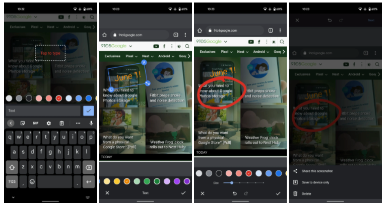 Пользователь сможет обрезать скриншот, добавить текст разных стилей и нарисовать что-то на изображении, доступно 18 цветов и шесть вариантов толщины штриха. После проведения всех необходимых процедур над скриншотом, пользователь может поделиться им, сохранить на своё устройство или просто удалить.