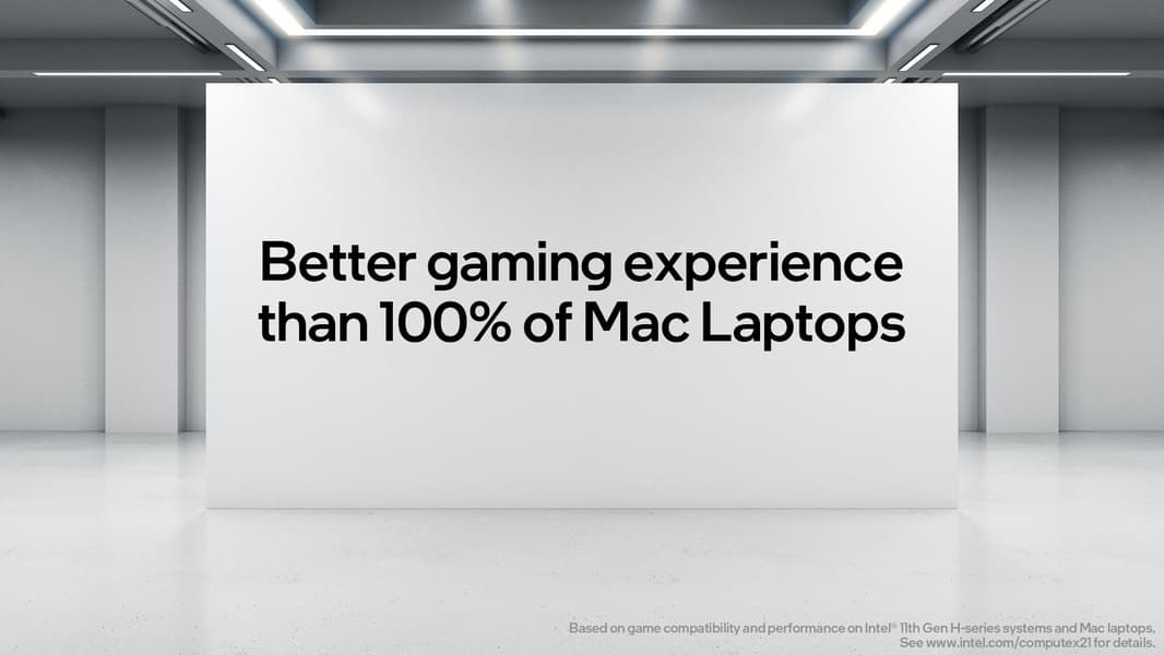 Но теперь Intel решила пойти дальше и фактически противопоставляет себе свои же процессоры. Если точнее, компания утверждает, что ноутбуки с CPU Intel лучше любого MacBook в играх, и при этом сравнивает с 16-дюймовым MacBook Pro, основанным на Core i9-9980H. Таким образом, тут Intel важнее показать не преимущество процессора, а всё же преимущество платформы в целом.