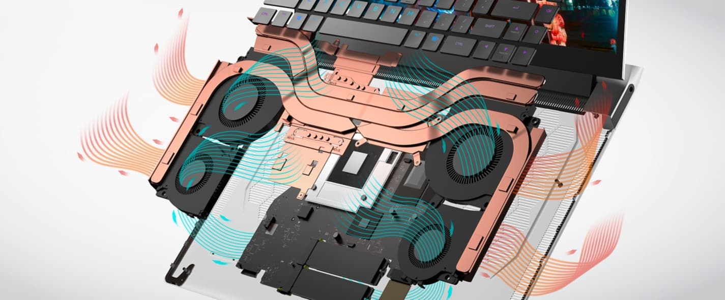 Как можно видеть, ноутбуки, хотя и тонкие, далеко не самые лёгкие. Это объясняется очень массивной системой охлаждения, которая нужна для отвода огромного количества тепла. В обоих ноутбуках имеется массив тепловых трубок и целых четыре вентилятора. Кроме того, используется уникальный термоинтерфейс Element 31.
