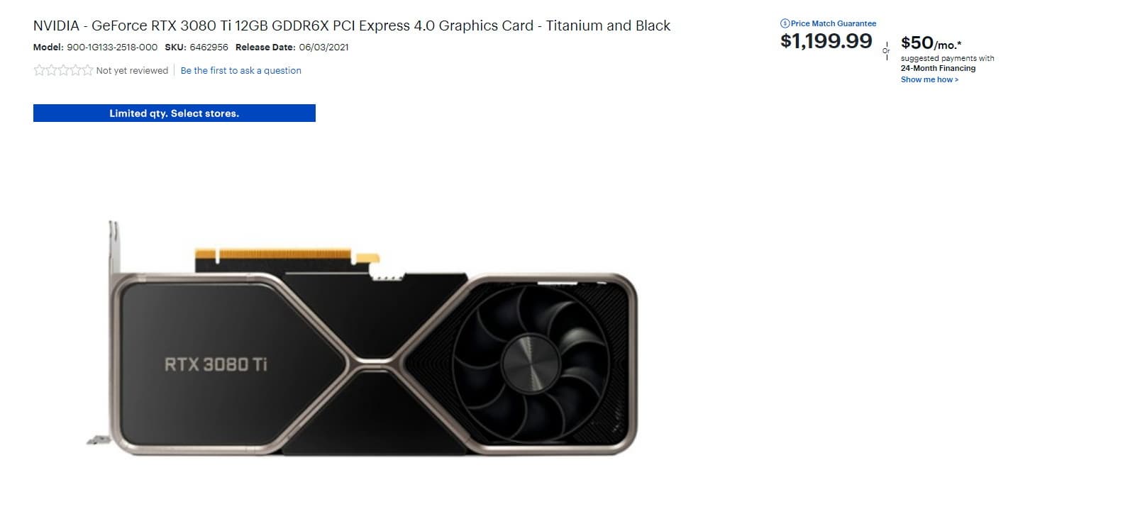 Однако бывают исключения. Крупнейшая американская сеть BestBuy, похоже, решила привлечь дополнительное внимание, выставив RTX 3080 Ti за те самые 1200 долларов.