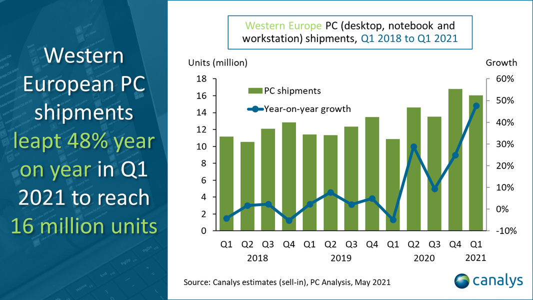 В первом квартале 2021 года поставки ПК в Западной Европе достигли 16,1 млн единиц, что на 48% больше по сравнению с аналогичным периодом прошлого года. Такие данные приводит аналитическая компания Canalys, уточняя, что под ПК понимаются настольные компьютеры, ноутбуки и рабочие станции. По мнению аналитиков, рост продаж свидетельствует о том, что импульс спроса, начавшийся в 2020 году в связи с COVID-19, сохраняется и в 2021 году.