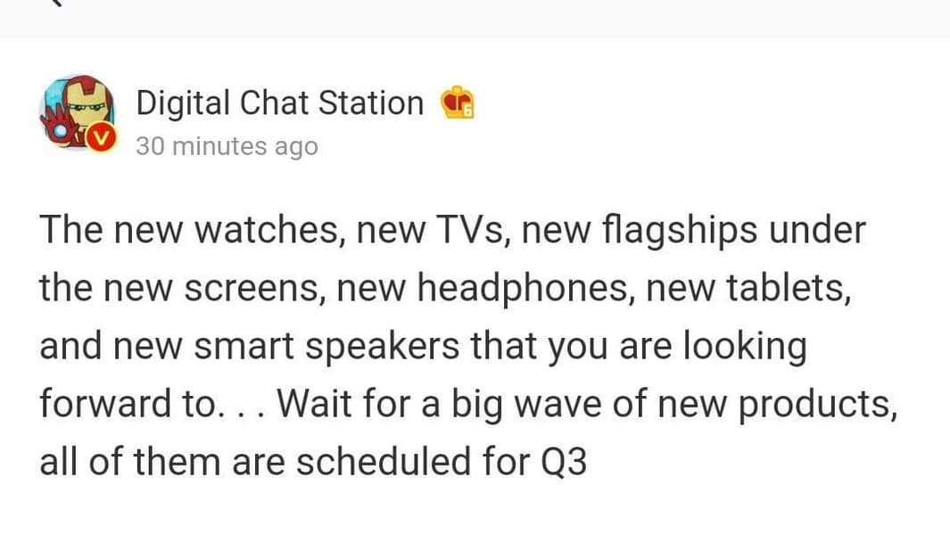 Об этом пишет китайский инсайдер, известный под ником Digital Chat Station. По его данным, в период с июля по сентябрь Xiaomi представит много всего нового: умные часы, телевизоры, флагманские смартфоны с подэкранной камерой (ждем Mi Mix 4, но могут быть и другие модели), наушники, планшеты (Mi Pad 5), умные колонки. Пока нет никаких характеристик, но по этому перечню видно, что станок Xiaomi будет работать на полную.