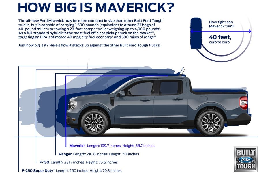 Ford утверждает, что Ford Maverick является первым пикапом, который стандартно поставляется с гибридной трансмиссией. В нём установлен 2,5-литровый 4-цилиндровый двигатель мощностью 162 л.с. в паре с первым электродвигателем собственной разработки Ford мощностью 94 кВт. При этом суммарная мощность составляет 191 л.с., а привод является передним. Компания заявляет расход топлива около 6,4 л на 100 км, что позволяет пикапу проехать более 800 км с полным баком, вмещающим 52 л.