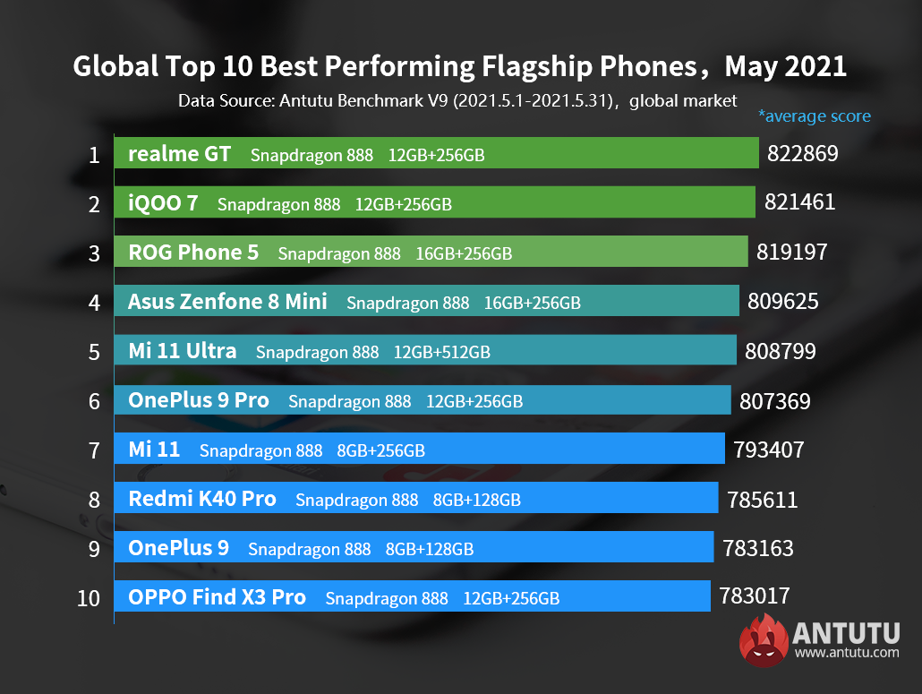 В мае 2021 года рейтинг AnTuTu впервые в истории возглавил флагманский смартфон Realme. Им стала модель Realme GT на основе однокристальной системы Qualcomm Snapdragon 888, получившая 822 869 баллов.