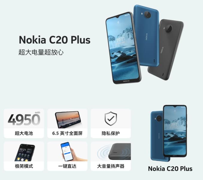 Nokia C20 Plus выполнен в корпусе из поликарбоната. Габариты новинки — 165,4 х 75,85 х 9,35 мм, масса — 204,7 грамма. Розничные продажи устройства в Китае стартуют 16 июня.