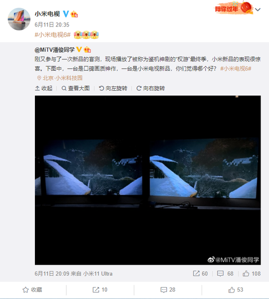 На страничке подразделения Xiaomi, занимающегося выпуском телевизоров, появилась заметка главного менеджера Xiaomi TV Пан Джуна (Pan Jun), в которой он рассказал о слепом тестировании новинок департамента. На фото на экранах телевизоров запечатлен финальный сезон местного телесериала, а сам топ-менеджер рассказал, что «производительность новинок Xiaomi приятно удивила». Под производительностью здесь, скорее всего, понимается качество изображения – и оно должно быть не хуже, чем у конкурентов.