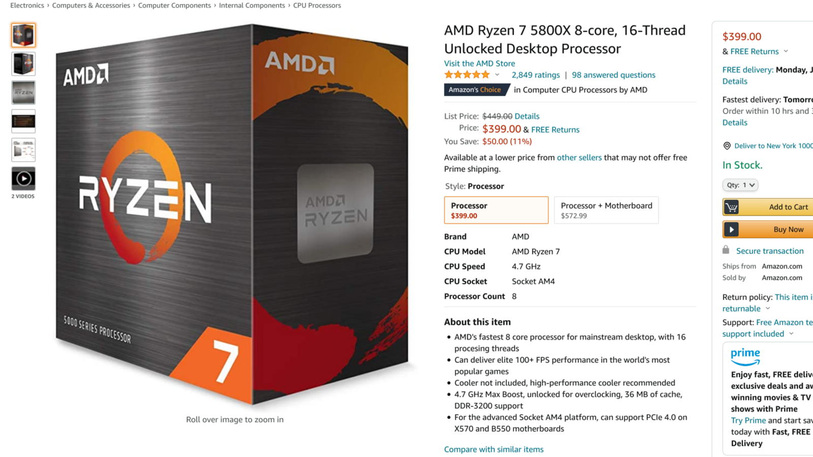 Что интересно, Ryzen 7 5800X — единственный топовый процессор линейки, который сейчас предлагается в США дешевле своей изначальной цены. Например, Ryzen 9 5900X продаётся за 690 долларов вместо 550 долларов, а Ryzen 9 5950X реально купить примерно за 1000 долларов, хотя рекомендованная цена — 800 долларов.