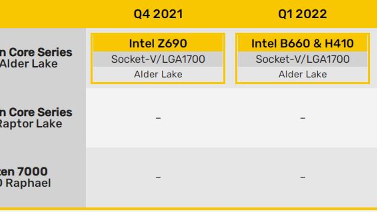 Сразу же делая оговорку, что это неподтверждённые сведения, источник опубликовал график выхода платформ, поддерживающих память DDR5. Согласно этому графику, первой будет компания Intel, которая выпустит чипсет Z690 и процессоры Alder Lake в исполнении LGA1700 в четвёртом квартале текущего года. В первом квартале 2022 года для этих процессоров будут выпущены наборы системной логики B660 и H610 (на иллюстрации он ошибочно назван H410). И лишь в следующем, то есть во втором квартале 2022 года, компания AMD представит свою платформу с поддержкой DDR5, включающую чипсет X670 и процессоры Raphael. В третьем квартале подойдёт очередь чипсета Intel Z790. Платы на нем всё ещё будут оснащены разъёмом LGA1700, но в него можно будет установить не только процессоры Alder Lake, но и процессоры Reptor Lake. Наглядно график показан ниже: