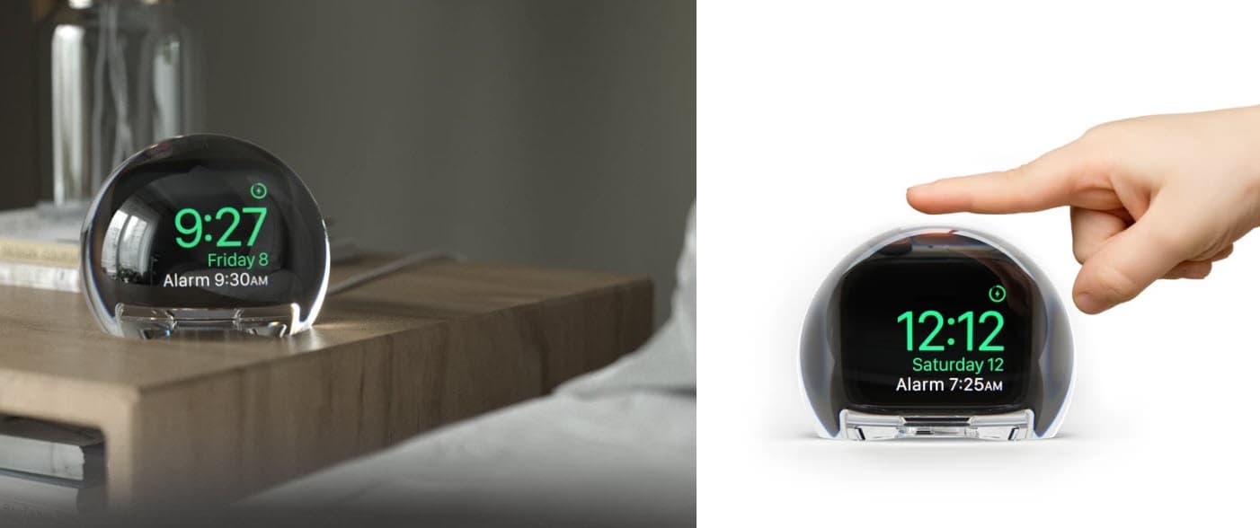 Это зарядная станция, которая оснащена большим увеличительным стеклом, превращающим Apple Watch в приличный прикроватный будильник. При этом вы получаете не только возможность заряжать часы и видеть увеличенные цифры и буквы.