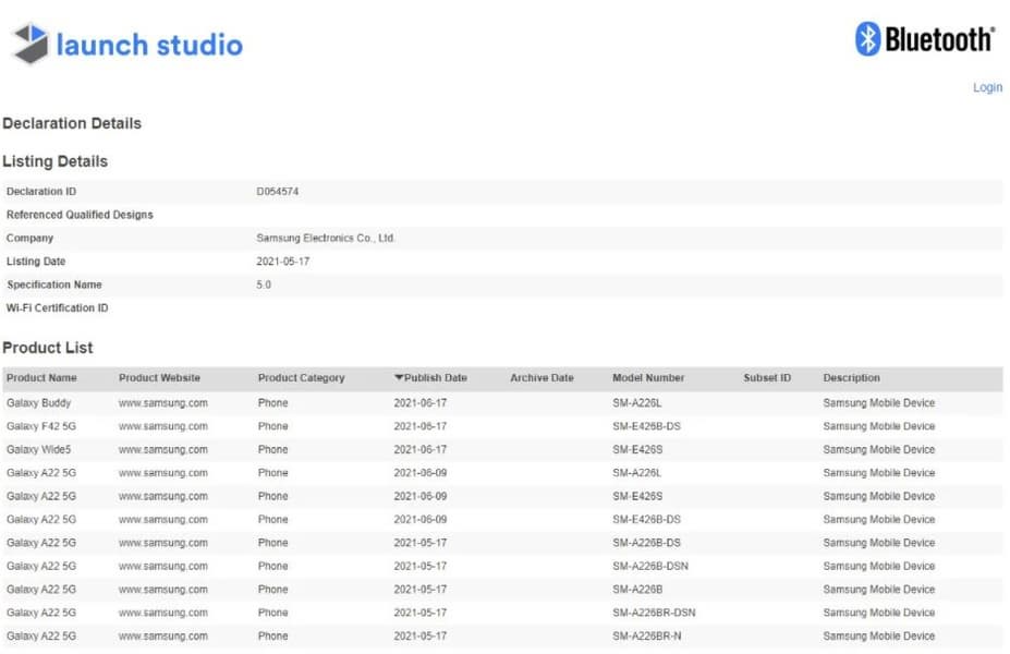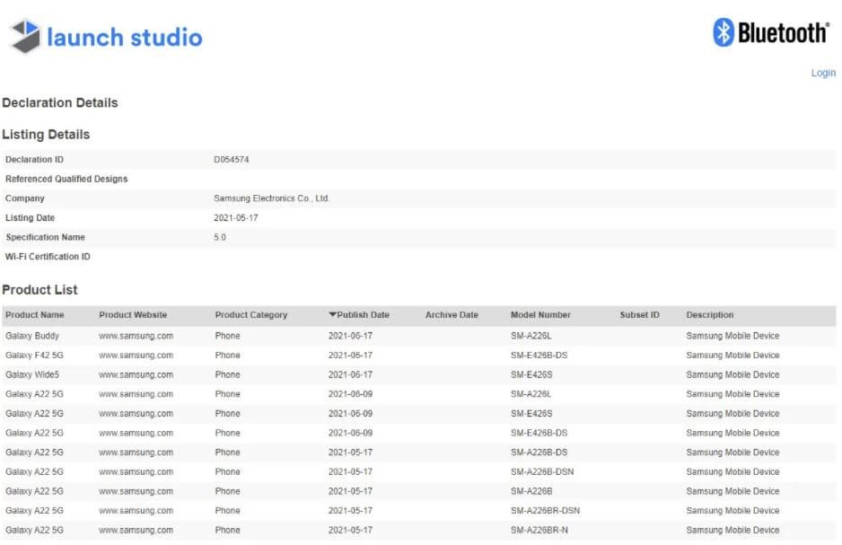 Samsung готовит очередной недорогой смартфон с поддержкой 5G. Модель под обозначением Galaxy F42 5G (каталожный номер SM-E426B) ранее уже получила сертификат Wi-Fi, а сейчас она засветилась в базе отраслевой группы Bluetooth SIG. Один сертификат, выписанный и на Galaxy F42 5G, и на Galaxy A22 5G, Galaxy Buddy и Galaxy Wide 5, говорит о том, что все эти модели являются клонами Galaxy A22 5G. А раз так, то и характеристики у Galaxy F42 5G будут такие же, как у Galaxy A22 5G.
