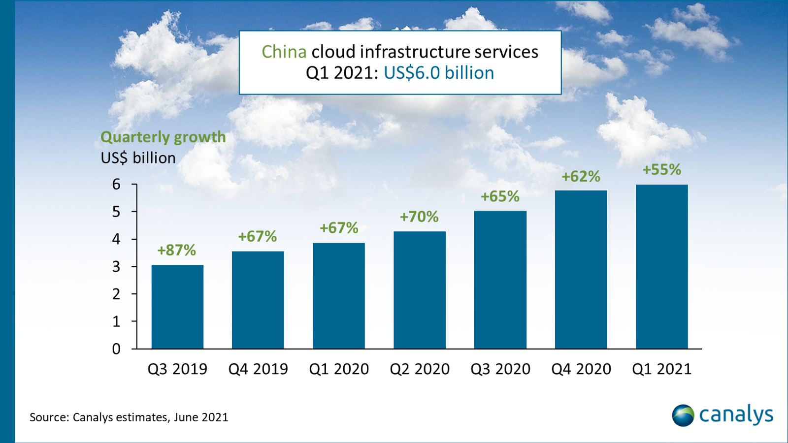 В первом квартале этого расходы на услуги облачной инфраструктуры в Китае выросли по сравнению с аналогичным периодом прошлого года на 55%. В абсолютном выражении они достигли 6,0 млрд долларов. Такие данные приводит аналитическая компания Canalys.