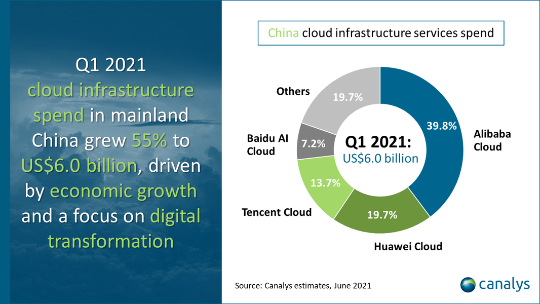 По данным Canalys, рост облачных инфраструктурных услуг в Китае продолжал опережать рост в остальном мире. Этому способствует поддержка со стороны правительства, которое присвоило облачным сервисам стратегический приоритет. Ключевые факторы, способствующие инвестициям в этот сегмент, включают быстрый экономический рост и повышенное внимание к цифровой трансформации после пандемии COVID-19. Сейчас Китай уступает по расходам на облачные услуги только США, занимая 14% мирового рынка по сравнению с 12% в первом квартале 2020 года.