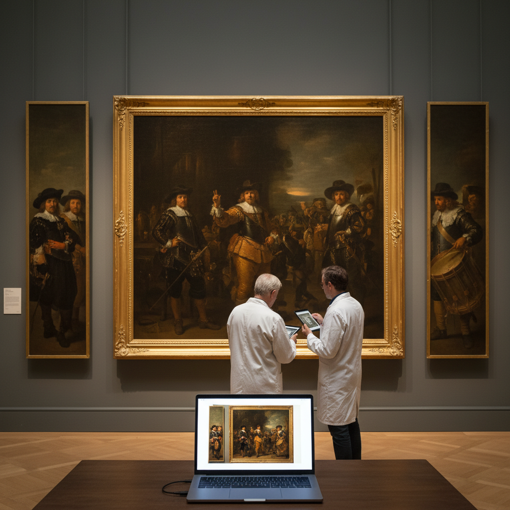 Рембрандт закончил работу над большим полотном, которое обычно называют «Ночной дозор», в 1642 году. Картина, которая сейчас считается одним из величайших шедевров Золотого века Голландии, в 1715 году была обрезана со всех четырёх сторон во время переезда в новый зал, где иначе не помещалась. Хотя эти полоски не были найдены, есть копия, сделанная Герритом Люнденсом примерно в 1655 году. Реставраторы и специалисты в области ИИ использовали её, чтобы воссоздать недостающие части с сохранением стиля Рембрандта.