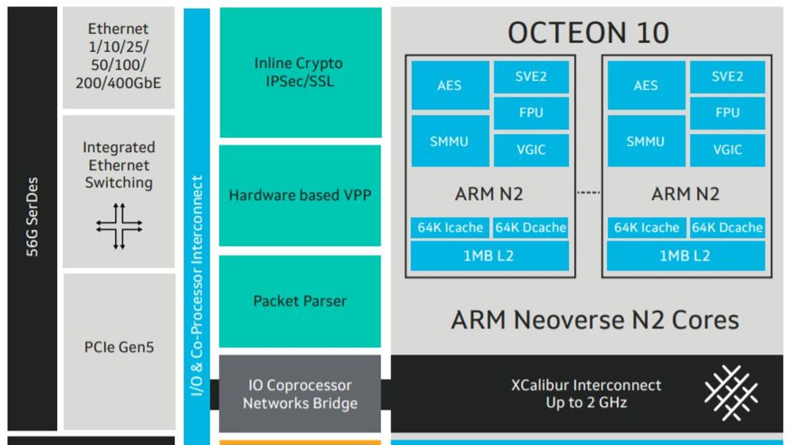 Производитель отмечает, что это первое решение такого рода, включающее ядра Arm Neoverse N2 и рассчитанное на 5-нанометровый техпроцесс, первое — со встроенными средствами аппаратного ускорения алгоритмов искусственного интеллекта и машинного обучения, первое — со встроенным коммутатором с пропускной способностью 1 Тбит/с, а также первое — с аппаратным ускорителем векторной обработки пакетов (VPP). Невозможно не упомянуть поддержку передовых технологий ввода-вывода, включая DDR5 и PCIe 5.0.