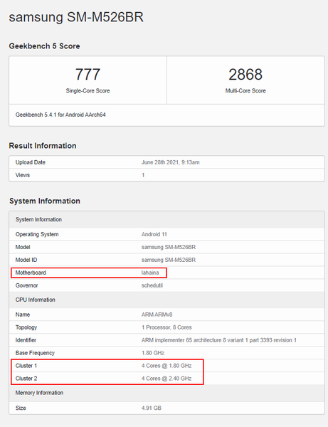 Там указана платформа с кодовым именем Lahaina, а это Snapdragon 888. При этом ни производительность, ни подробности касательно двух четырёхъядерных кластеров с частотами 1,8 и 2,4 ГГц топовой платформе Qualcomm не соответствуют.