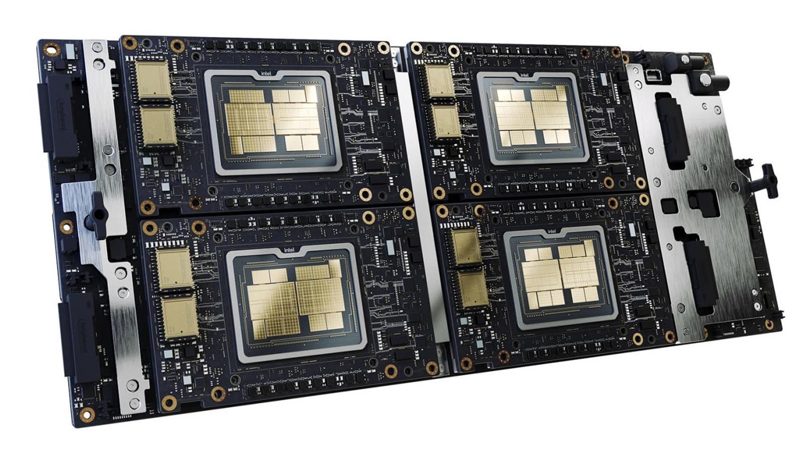 Отдельно Intel сегодня показала ускоритель Ponte Vecchio в форм-факторе OAM (Open Accelerator Module) в виде системы с четырьмя такими модулями.