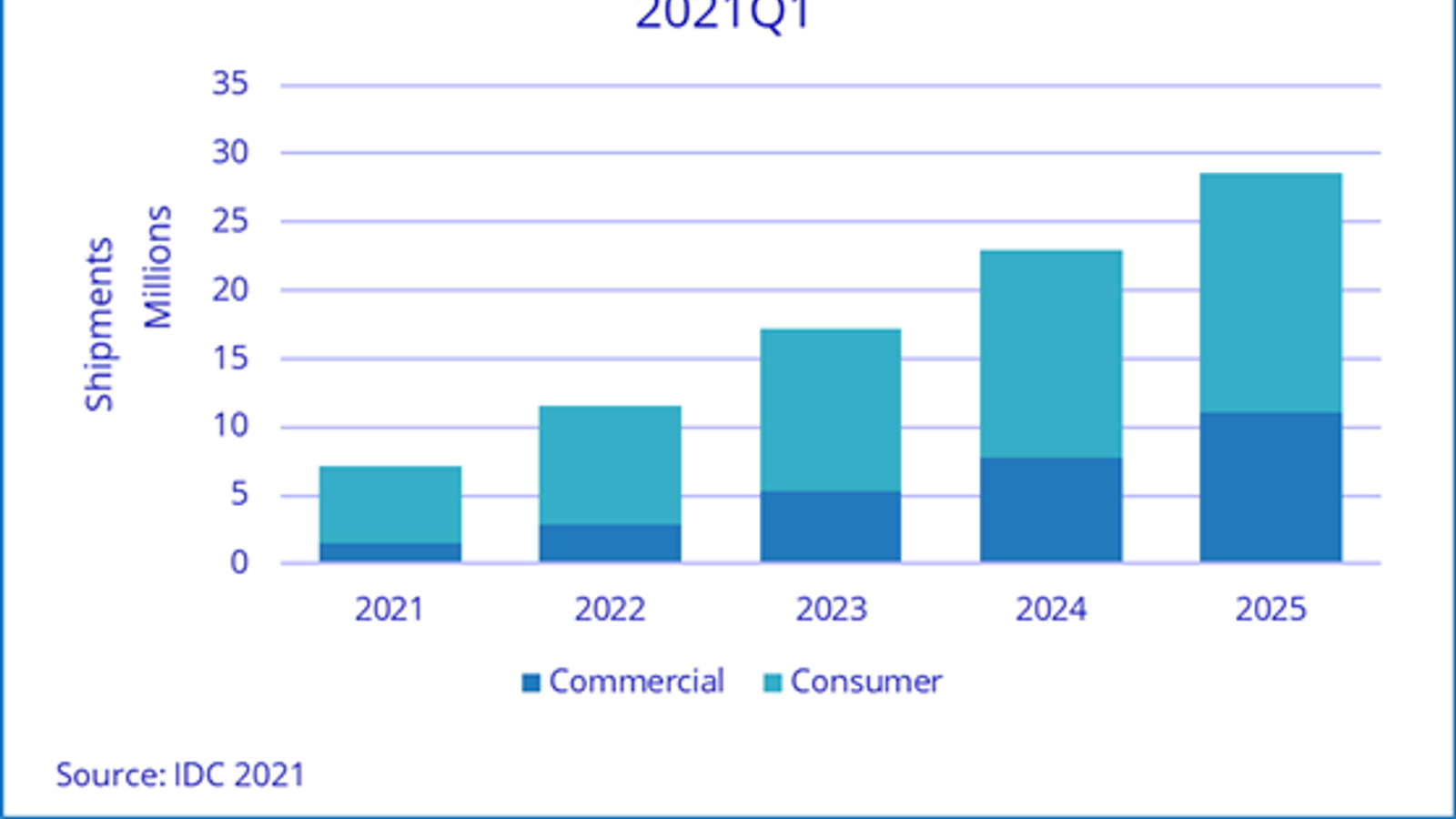 В IDC прогнозируют, что поставки гарнитур виртуальной реальности в 2021 году вырастут на 28,9%. Это меньше, чем могло бы быть, но большему росту помешает нехватка компонентов. Долгосрочная перспектива остается радужной. По прогнозу IDC, среднегодовой темп роста в период до 2025 года составит 41,4%, так что в 2025 году будет отгружено 28,6 млн устройств.