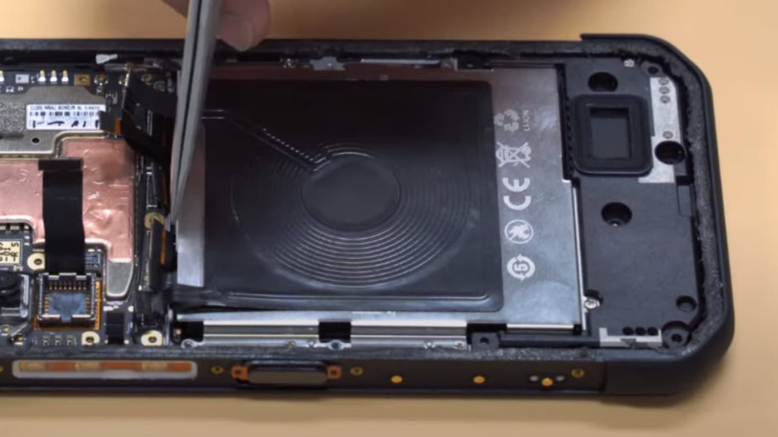 Слот для двух SIM-карт расположен внизу, рядом с портом USB-C. Кнопка включения, сканер отпечатков пальцев и качелька регулировки громкости расположены на правой стороне телефона. При снятии двухслойной водонепроницаемой крышки можно увидеть модуль беспроводной зарядки, систему камер, включающую модуль FLIR, водонепроницаемые динамики, антенну NFC, а также большой аккумулятор.