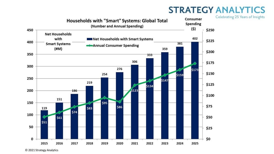 Быстрый рост, в результате которого рынок впервые преодолеет отметку 100 млрд долларов, в Strategy Analytics объясняют отложенным спросом. В последующие годы рост продолжится, но он будет медленнее. В результате в 2025 году рынок достигнет 173 млрд долларов. К тому времени почти 20% всех домохозяйств в мире будут использовать хотя бы один продукт для умного дома. Для сравнения: в этом году проникновение достигнет 15%.