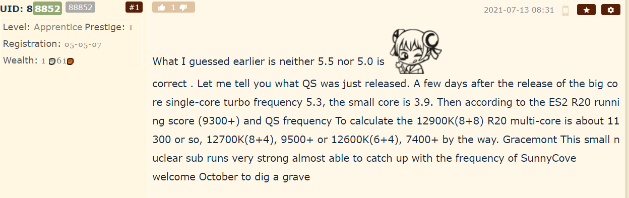 Так, в публикации на форуме NGA.cn утверждается, что флагманская модель с 8 высокопроизводительными (С) и 8 высокоэффективными ядрами (с) рассчитана на базовую частоту 3,9 ГГц и повышенную частоту 5,3 ГГц. В публикации также рассматриваются возможные конфигурации процессоров серии Core 12-го поколения, включая i7-12700K с конфигурацией 8C + 4c и i5-12600K с конфигурацией 6C + 4c. В тесте Cinebench R20 эти процессоры якобы демонстрируют результаты 9500+ и 7400+ баллов соответственно. Инженерный образец Core i9-12900K демонстрировал результат 9300+, но расчёт для квалификационного образца с учётом приведённой выше частоты разгона даёт оценку 11 300+ баллов, то есть больше, чем у 16-ядерного процессора AMD Ryzen 9 5950X, который набрал около 10 400 баллов.