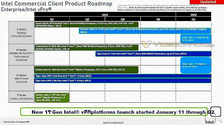 В распоряжении источника оказался график выпуска процессоров Intel с поддержкой технологии vPro. Хотя документ и не самый свежий — он датирован 16 января 2021 года — это самая актуальная информация на этот счет. Если верить «слайдам, процессоры Alder Lake-S и Alder Lake-P должны быть выпущены в первом квартале 2021 года.