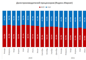 Парадоксы российского рынка процессоров: у Intel самая большая доля за три года, но абсолютное большинство в топ-10 — у процессоров AMD