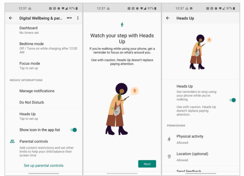 В ноябре 2020 года энтузиасты впервые заметили предупреждения Heads Up (можно перевести и как «Берегись», и как «Подними голову») в Digital Wellbeing, а в апреле Google запустила эту функцию для линейки фирменных смартфонов Pixel.