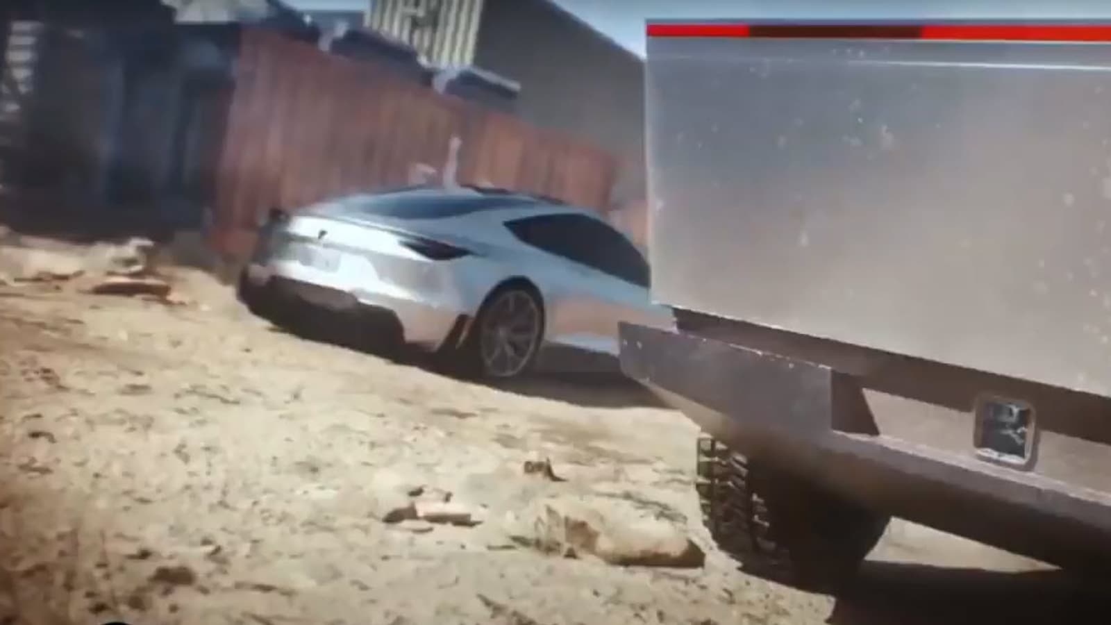 События трейлера разворачиваются в постапокалиптическом мире, где по улицам бродят враждебно настроенные роботы, а девушка, сидящая в Cybertruck расстреливает их прямо из автомата. Затем Cybertruck захватывает большую бомбу и взрывает некий портал.