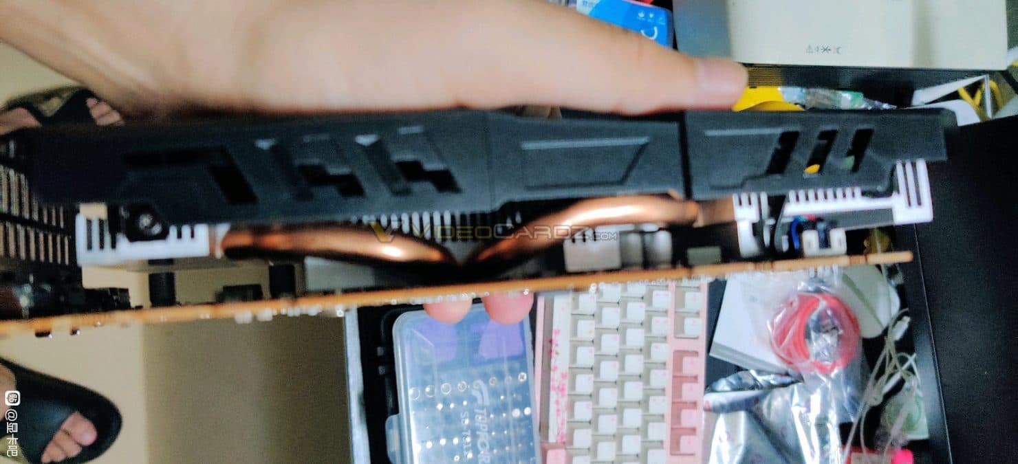 Кто производитель данной конкретной видеокарты — непонятно. Скорее всего, за ней стоит какая-то местная китайская компания. Устройство оснащено двухслотовым кулером, двумя вентиляторами, довольно простеньким алюминиевым радиатором и двумя тепловыми трубками. Никакой теплораспределительной пластины на тыльной панели нет. Дополнительное питание осуществляется от одного восьмиштырькового разъёма.
