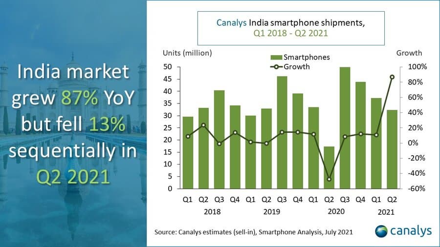Поставки смартфонов в Индии во втором квартале упали на 13% по сравнению с первым кварталом. Всего за три месяца, с апреля по июль, было отгружено 32,4 млн устройств. Аналитики Canalys объясняют падение отрицательным воздействием второй волны COVID-19. Отметим, что по сравнению со вторым кварталом 2020 года, то есть в годовом выражении, наблюдается рост на 87%.
