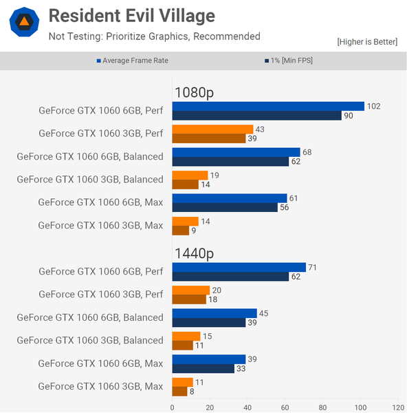 В качестве исключений отметим Assassin's Creed Valhalla, где разница между картами примерно двукратна, и младшего адаптера попросту недостаточно, Doom Eternal, где из-за недостатка памяти игра попросту не запускается, Cyberpunk 2077, которая попросту очень требовательная к производительности, и Resident Evil Village, где недостаток памяти катастрофически сказывается на количестве кадров в секунду, из-за чего младшая модель в три-четыре раза медленнее старшей.