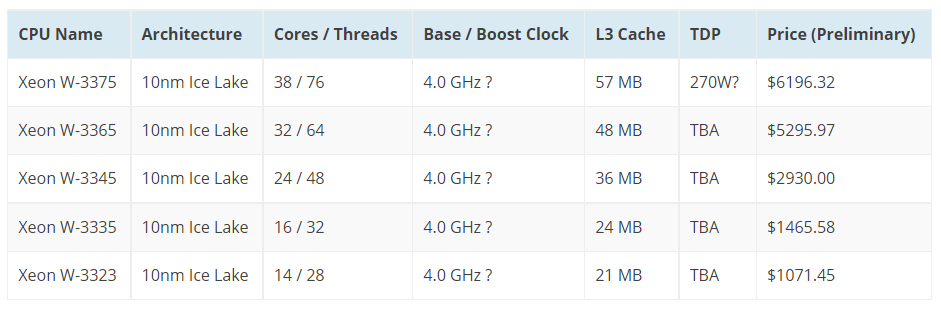 Согласно недавним утечкам, линейку Xeon W-3300 возглавит 38-ядерный Xeon W-3375 с 57 МБ кеш-памяти третьего уровня, TDP около 270 Вт и ценой в 6200 долларов. Какие процессоры достанутся топовому ПК Apple, пока неизвестно.