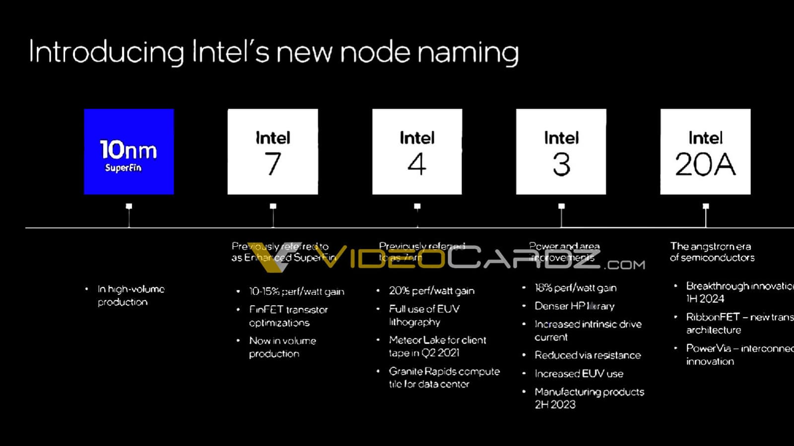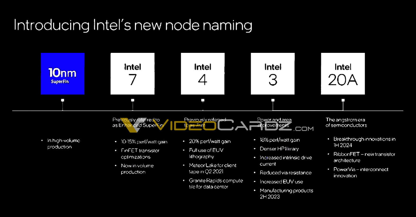 Техпроцесс Intel 20A запланирован на первую половину 2024 года. Символ «A» в обозначении означает ангстрем — 0,1 нм. На этом этапе в ход будет пущена новая структура транзисторов, известная как RibbonFET и инновация в области внутренних соединений под названием PowerVia.