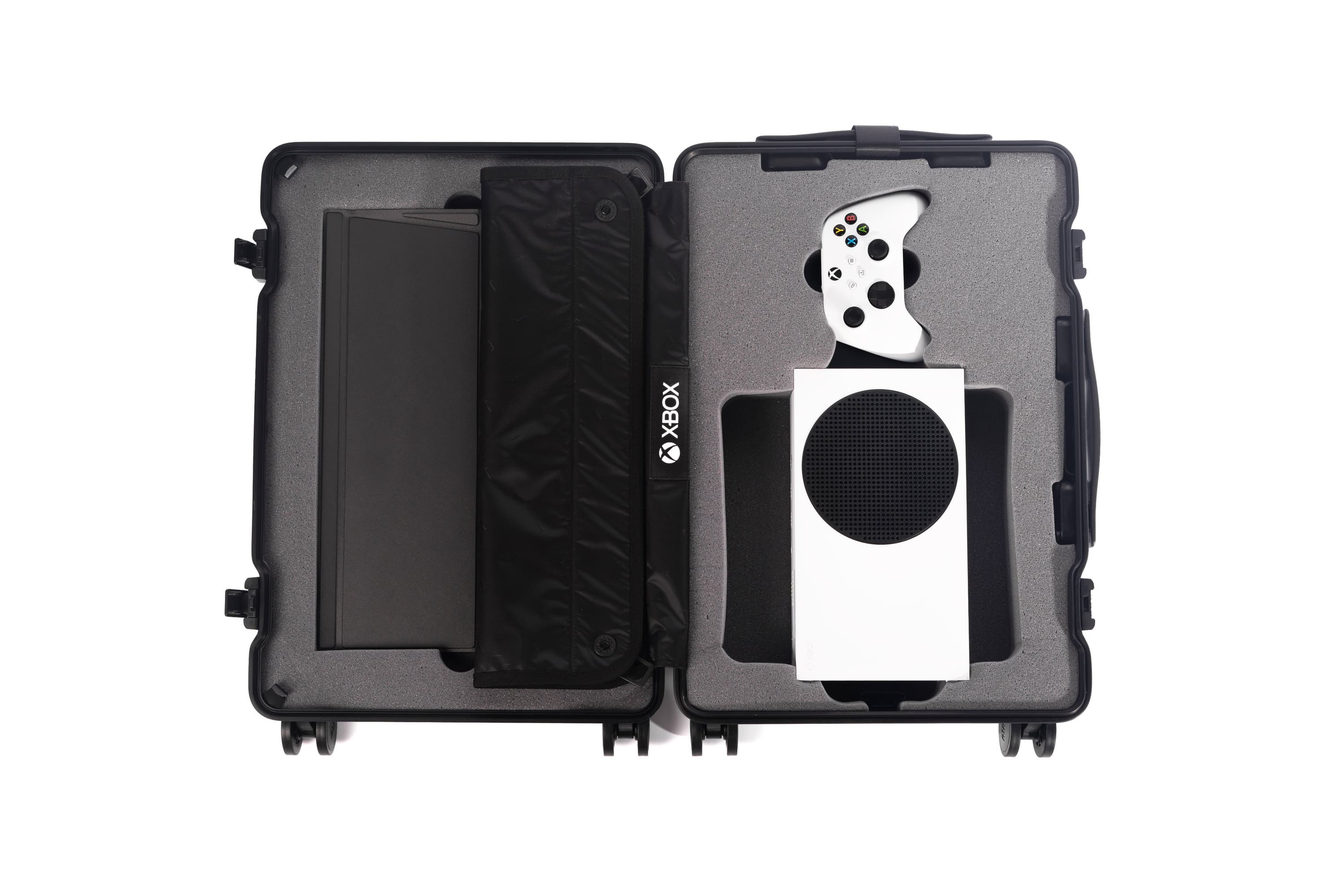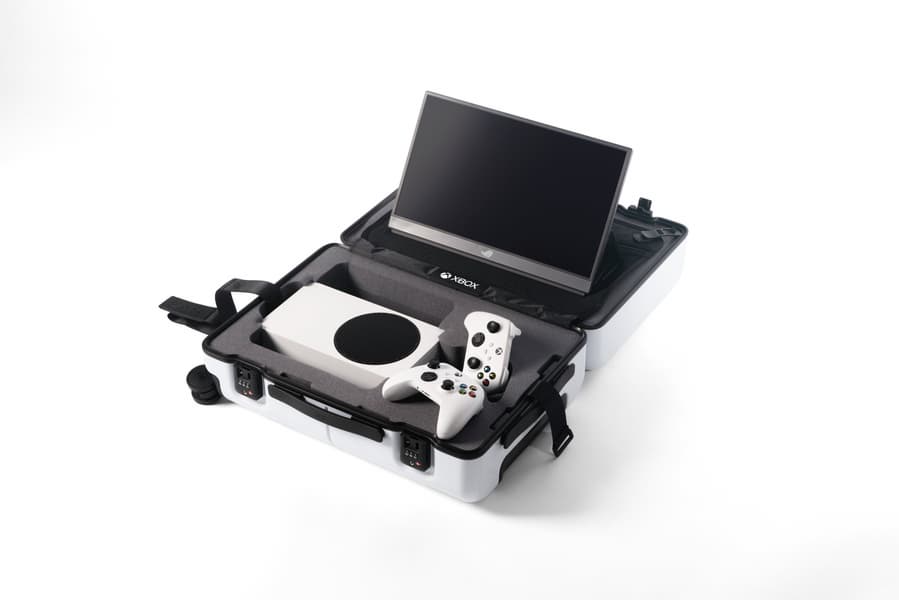 Такой чемодан с ручкой и на колёсиках выглядит похоже на Xbox Series S. Он приспособлен специально для перевозки этой приставки в комплекте с двумя контроллерами и портативным монитором, чтобы можно было начать играть в Microsoft Flight Simulator в любом месте, где есть розетка.