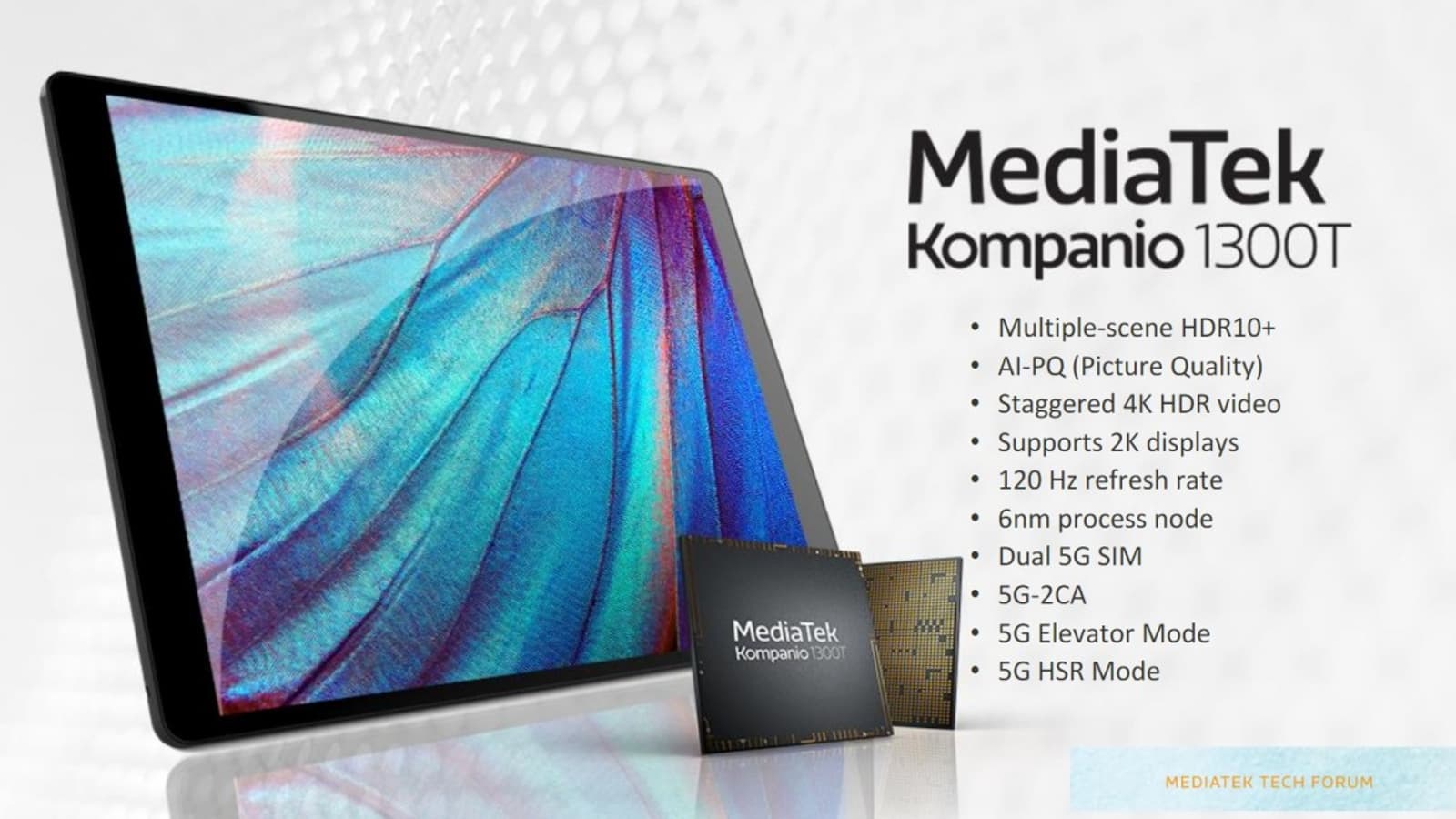 MediaTek представила однокристальную систему Kompanio 1300T, заявив, что это её лучшее решение для планшетов и ноутбуков на базе ARM. Аппаратно он аналогичен однокристальной системе Dimensity 1200 и является обновлением прошлогодней SoC Kompanio 1200 (MT8195).