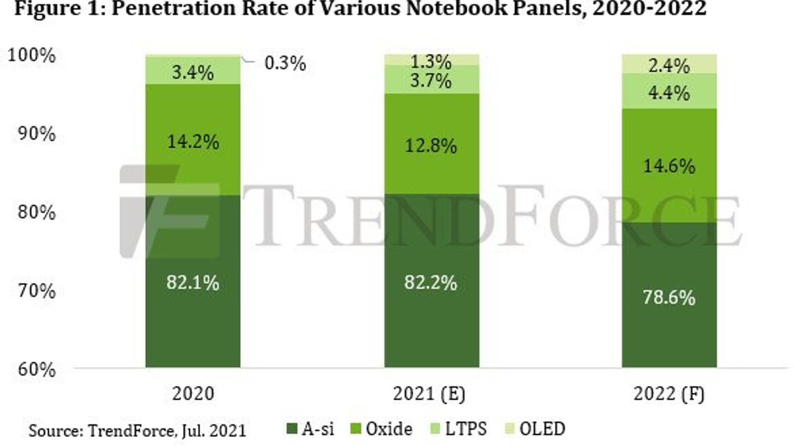 Панели OLED в основном поставляет Samsung Display Company (SDC). В 2020 году эта компания отгрузила 800 000 штук панелей. Ожидается, что в этом году SDC отгрузит более 4 млн панелей OLED для ноутбуков. В этом или следующем полугодии к SDC присоединится китайская компания EverDisplay Optronics (EDO). В TrendForce ожидают, что в этом году на панели OLED придётся 1,3% поставок панелей для ноутбуков, в будущем — 2,4%.