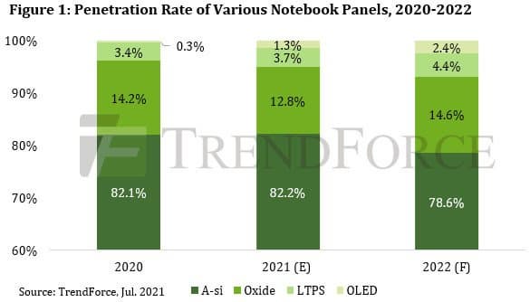 Панели OLED в основном поставляет Samsung Display Company (SDC). В 2020 году эта компания отгрузила 800 000 штук панелей. Ожидается, что в этом году SDC отгрузит более 4 млн панелей OLED для ноутбуков. В этом или следующем полугодии к SDC присоединится китайская компания EverDisplay Optronics (EDO). В TrendForce ожидают, что в этом году на панели OLED придётся 1,3% поставок панелей для ноутбуков, в будущем — 2,4%.