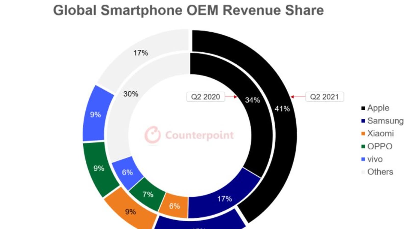 По подсчётам Counterpoint, всего за квартал было отгружено 329 млн смартфонов, что соответствует росту на 19% по сравнению аналогичным периодом 2020 года, но на 7% меньше, чем в первом квартале 2021 года. Выручка на рынке смартфонов выросла в годовом выражении на 25% и достигла 96 млрд долларов. Это рекорд для второго квартала.