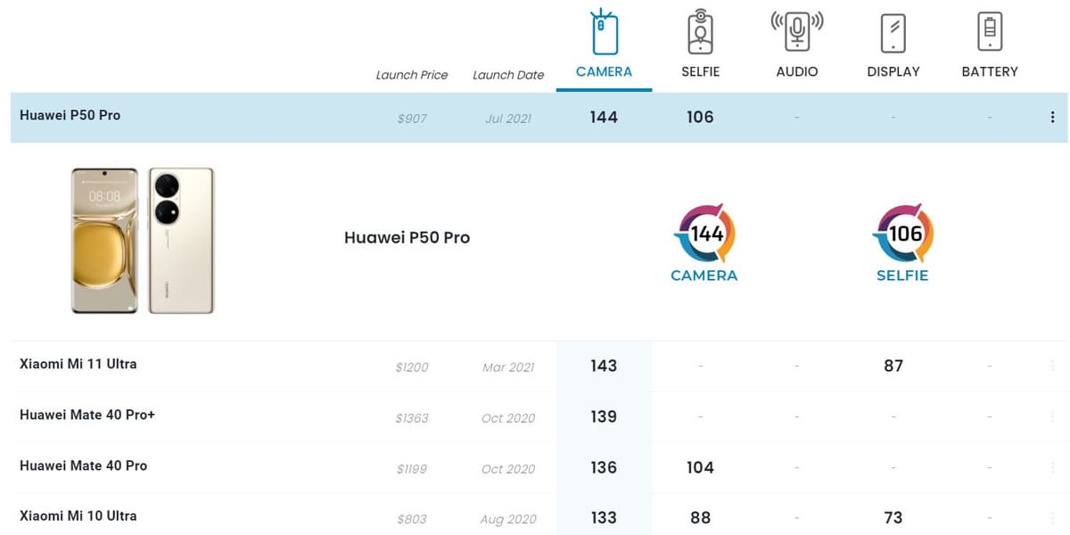 Huawei P50 Pro возглавил рейтинг основных камер с результатом 144 балла — на один балл больше, чем у прошлого «номера один», Xiaomi Mi 11 Ultra, и на внушительные пять баллов больше, чем у Huawei Mate 40 Pro+. Интересно, что в топ-5 рейтинга лучших камерофонов мира сейчас три модели у Huawei и две у Xiaomi. Для сравнения: лучший из смартфонов Apple лишь на девятой позиции.