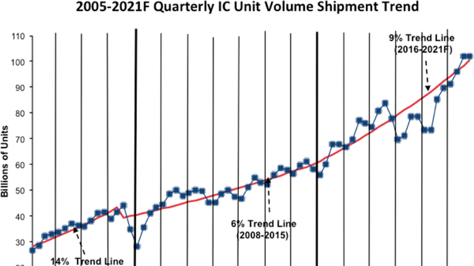 После падения объёмов поставок на 6% в 2019 году и роста на 8% в 2020 году IC Insights прогнозирует огромный скачок в этом году. Ожидается, что поставки вырастут на 21%. Всего будет отгружено 391,2 млрд микросхем. Историческая справка: это в 11 раз больше, чем 34,1 млрд штук, отгруженных в 1990 году.