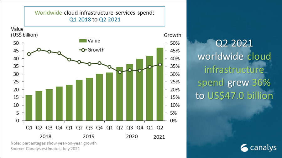 Во втором квартале 2021 года расходы на услуги облачной инфраструктуры составили 47,0 млрд долларов, увеличившись на 5 млн долларов по сравнению с первым кварталом. Рост в годовом выражении составил 12 млрд долларов, или 36%. Такие данные содержатся в отчёте, подготовленном специалистами аналитической компании Canalys.