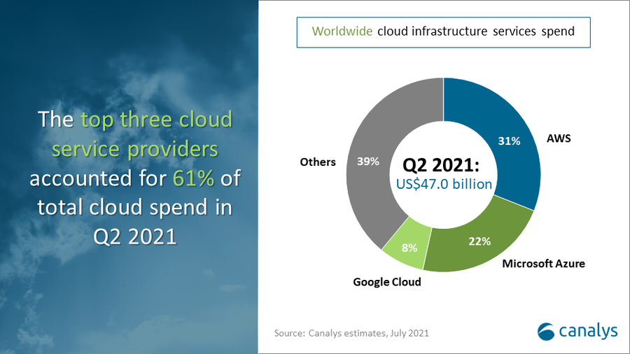 Ведущим поставщиком облачных услуг по итогам второго квартала 2021 года является Amazon Web Services (AWS) с долей 31%. Второе место, с 22%, занимает Microsoft Azure. Замыкает тройку Google Cloud с 8%.